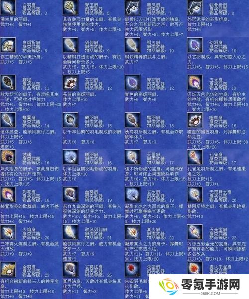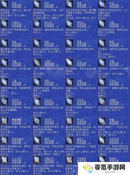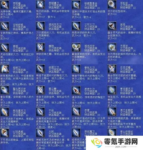 刀类大全:111 翔龙偃月刀 大刀 等级30 武力+21 体力+25 技力+10 忠诚+15 月轮烈光斩 神鬼乱舞 黄龙天翔 八方斩 破城神鎚 增我将攻 冲阵破坏 破城 大范围劈斩112 青龙偃月刀 大刀 等级29 武力+20 体力+20 技力+5 忠诚+13 月轮烈光斩 神鬼乱舞 黄龙天翔 增我将攻 大范围劈斩113 雷公鞭 大刀 等级28 武力+19 体力+5 技力+5 忠诚+13 浮雷阵 五雷轰顶 雷光焦狱 局部破坏 铁壁 引天雷杀敌114 虎贲大刀 大刀 等级28 武力+19 体力+8 技力+8 忠诚+13 月轮烈光斩 刚牙巨虎 紧急补强115 日月双锤 大刀 等级27 武力+18 体力+5 技力+8 忠诚+12 剑轮斩 八卦六角阵 挪移阵 紧急清野116 鳌头两刃斧 大刀 等级27 武力+19 体力+5 技力+5 忠诚+12 剑轮斩 三圣华斩 破城巨鎚 紧急侦察117 战国大刀 大刀 等级26 武力+18 智力+1 体力+5 技力+8 忠诚+12 邪灵妖刃 破城巨鎚 简易补强118 春秋大刀 大刀 等级26 武力+19 体力+5 忠诚+12 噬血魔刃 天剑开光 快速破坏119 混沌双斧 大刀 等级24 武力+18 忠诚+11 地龙震 五岳华斩 灭敌将攻 大范围劈斩120 天罡斧 大刀 等级24 武力+18 忠诚+11 五雷轰顶 雷光焦狱 气疗121 混沌开天刀 大刀 等级23 武力+17 忠诚+10 火龙焰 巨木妖尸 压制杀气 狂击 大范围劈斩122 三环大刀 大刀 等级23 武力+18 智力-3 忠诚+10 风龙旋 地龙震 压制杀气123 波母 大刀 等级23 武力+18 忠诚+10 五岳华斩 混元一气 匿踪潜行恢复体力124 南极 大刀 等级23 武力+18 体力+10 技力+10 速度+2 忠诚+10 火龙怒焰 挪移阵 假传冲锋 拆招125 编驹 大刀 等级23 武力+18 忠诚+10 水龙狂涛 七星灯 天灯照影224 UJ大鸡腿 大刀 等级20 武力+5 智力+5 体力+30 技力+30 速度+1 恢复体力
