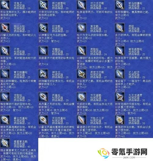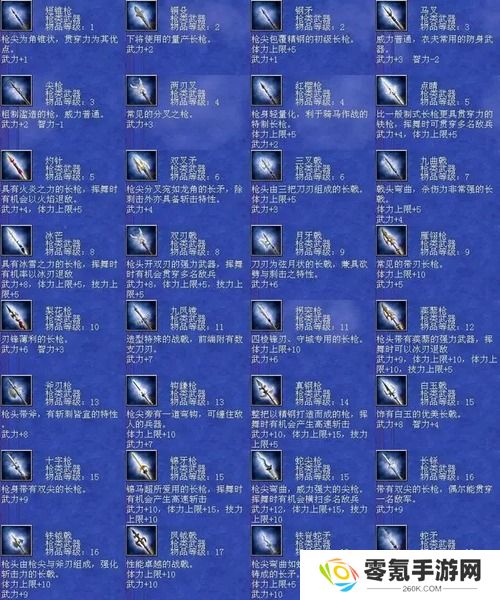 枪类大全:157 神鬼方天戟 枪 等级 31 武力+19 体力+10 技力+10 速度+2 忠诚+13 飞鬼戟 神鬼乱舞 大地狂啸 五岳华斩 泰山压顶 封武将技 绝地之眼 斗志 大范围挥斩158 方天画戟 枪 等级30 武力+18 体力+5 技力+5 速度+1 忠诚+12 飞鬼戟 神鬼乱舞 大地狂啸 五岳华斩 封武将技 大范围挥斩159 万胜丈八矛 枪 等级 30 武力+19 体力+45 忠诚+13 长枪突击 铁骑突击 突剑四方 八卦突斩 夺气术 加速急气 通天之眼 刚体 同时重伤两名敌人160 丈八蛇矛 枪 等级29 武力+17 体力+30 忠诚+12 长枪突击 铁骑突击 突剑四方 八卦突斩 加速急气 一骑当千161 九天龙魂贯 枪 等级 30 武力+18 智力+5 体力+15 技力+15 忠诚+13 火龙怒焰 炎兽杀阵 八方斩 八卦突斩 混元一气阵 掩地之幕 蔽天之幕 斗志 贯穿四人162 龙胆枪 枪 等级 29 武力+16 智力+3 体力+10 技力+10 忠诚+12 火龙怒焰 炎兽杀阵 八方斩 八卦突斩 万法自然163 霸王凤凰枪 枪 等级 30 武力+18 体力+25 技力+20 忠诚+13 水龙狂涛 神鬼乱舞 五岳华斩 八卦突斩 七星续命灯 冲阵尽灭 封武将技飞马 贯穿四人164 凤凰枪 枪 等级 29 武力+17 智力+4 体力+5 技力+5 忠诚+11 水龙狂涛 神鬼乱舞 五岳华斩 八卦突斩 冲阵破坏 封武将技 横斩前排三人165 虎贲方天戟 枪 等级 27 武力+17 忠诚+11 分身斩 刚牙巨虎 魔灵枪兵 八卦斩 稳定军心 同时击伤多人166 神龙戈 枪 等级 26 武力+17 忠诚+11 地龙极震 水龙狂涛 火龙怒焰 风龙天旋 横斩前排三人167 破军蒺藜枪 枪 等级 25 武力+17 体力+15 忠诚+11 八方斩 魔灵枪兵 解除封技168 青天钩镰枪 枪 等级 25 武力+17 体力+10 忠诚+11 剑轮斩 月刃烈斩 灭敌军防169 西极 枪 等级 23 武力+15 体力+5 技力+5 忠诚+11 八卦四方阵 移气术 全面补强 技回 横斩前排三人170 不周 枪 等级 23 武力+15 体力+10 忠诚+11 幽冥鬼骑 挪移** 结构破坏179 铁脊蛇矛 枪 等级18 武力+10 体力+5 忠诚+8 地龙 剑轮舞