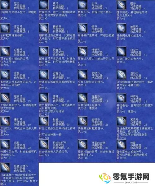 编号排序1、震雷青龙戟,编号:804。2、黄帝剑,编号:823。3、炼狱魔刀,编号:826。4、干将莫邪,编号:91。5、泰山府君杖,编号:112 。6、神鬼方天戟,编号:157。7、万胜丈八矛,编号:159。8、机铁火神弓,编号:111。9、天羽凤凰枪,编号:833。10、苍天帝剑,编号:850。三国群英传7的十大武器包括紫电、贲育、霸王枪、丈八蛇矛、方天画戟、青龙偃月刀、金龙连弩、雌雄双股剑、凤凰羽扇和青虹剑等。这些武器都有着不同的属性和效果,可以为玩家提供极大的帮助和支持。每个武器都具有独特的性质和功效。例如,紫电可以增加攻击力和射程,贲育则可以增加闪避和格挡率。霸王枪可以增加攻击力和暴击率,丈八蛇矛则可以增加攻击范围和穿透力。方天画戟可以增加攻击力和攻击距离,青龙偃月刀可以增加攻击力和暴击率,金龙连弩可以增加攻击速度和射程,雌雄双股剑可以增加攻击力和格挡率,凤凰羽扇则可以增加攻击力和攻击距离。青虹剑是一把全能的武器,可以同时增加攻击力、防御力和移动速度等属性。另外,想要获得这些十大武器并不容易,需要玩家在游戏中完成各种任务、挑战和探索。有些武器甚至需要从BOSS或其他特殊场景中获取。因此,玩家需要耐心地积累经验并不断提升自己的实力,才能有机会获得这些顶级武器。其次,每个武器的属性和效果都是不同的,需要根据不同的需求和游戏情况选择相应的武器。例如,长枪可以增加攻击距离和攻击范围,而大刀则可以增加攻击力和暴击率。铁斧则可以增加打断和撞击效果,弓箭则可以增加攻击速度和射程等。另外,玩家还可以通过购买、探索、任务奖励等多种方式获得各种类型和品级的武器。在游戏中,一些重要的任务和剧情中也会出现与武器相关的线索或提示,玩家需要认真阅读说明和对话,探索相关地点,寻找符合条件的武器,并按照游戏设定的要求完成任务。三国群英传7武器大全 全武器编号属性与技能剑类大全:42 干将莫邪 剑 等级40 武力+22 智力+10 体力+35 技力+35 速度+1 忠诚+16 分身斩 神剑闪华 莲花轰天 泰山压顶 黄龙天翔 军魂 诅咒 横斩前排三人43 草剃 剑 等级30 武力+17 智力+1 体力+10 技力+10 忠诚+10 分身斩 月轮烈光斩 食尸鬼阵 九尾妖狐 借尸还魂 童子降临 姬降临 倭国三神器44 冰凰炎凤 剑 等级29 武力+16 体力+8 技力+8 忠诚+12 八方斩 水龙狂涛 火龙怒焰 全面补强 结构破坏 迅雷 附加火焰/冰冻攻击45 仁义无双 剑 等级29 武力+17 智力+1 体力+10 技力+10 忠诚+12 八方斩 黄龙天翔 夺气术 通天之眼 绝地之眼 王道恢复体力46 寒铁双股剑 剑 等级28 武力+16 智力+1 体力+5 技力+5 忠诚+12 八方斩 夺气术 通天之眼 横斩前排三人47 巨阙剑 剑 等级28 武力+16 体力+10 忠诚+10 八卦斩 地龙极震 天剑神威 杀气 霸道巨剑48 魑魅魍魉 剑 等级28 武力+16 体力+10 邪灵妖刃 食尸鬼阵 魔灵刀兵 借尸还魂 尸魂 吸收敌人体力49 逆天剑 剑 等级28 武力+17 体力+5 技力+5 忠诚+12 分身斩 神剑闪华 月轮烈光斩 天灯照影 端正军纪 王道 加倍伤害50 倚天剑 剑 等级27 武力+14 体力+10 忠诚+10 分身斩 神剑闪华 增加经验 古代的神剑,有君临天下的气势51 虎牙剑 剑 等级26 武力+15 体力+10 忠诚+10 噬血魔刃 地龙震 御飞刀 杀气 凶残之剑52 皇天怒 剑 等级25 武力+15 忠诚+10 八方斩 破城神鎚 月轮烈光斩 局部破坏 大范围劈斩53 飞星 剑 等级24 武力+13 智力+1 速度+2 忠诚+12 天剑神威 神剑闪华 假传待命 迅捷非常之剑54 流采 剑 等级24 武力+14 智力+1 忠诚+12 天剑神威 假传冲锋 贯穿一人55 华铤 剑 等级24 武力+14 智力+1 忠诚+12 神剑闪华 端正军纪 加倍伤58 方土 剑 等级23 武力+14 忠诚+12 地龙极震 挪移阵 大略侦察 较强劈斩59 东极 剑 等级23 武力+15 体力+5 技力+5 忠诚+12 铁轮血斩阵 土遁隐杀 挪移** 大略清野 四极神兵60 破山剑 剑 等级22 武力+13 忠诚+10 地龙 天剑斩 土遁隐杀 拨云见日 斩岩破石的宝剑61 青釭剑 剑 等级22 武力+12 忠诚+10 三圣华斩 神剑闪华 铁轮血斩阵 天狗吞日 绝世名剑62 白虹 剑 等级22 武力+12 忠诚+10 四方斩暴击贯穿一人63 紫电 剑 等级22 武力+12 忠诚+10 雷击闪 浮雷 召引天雷杀敌64 辟邪 剑 等级22 武力+12 体力+10 技力+10 忠诚+10 四方斩 风龙 冲阵消除 驱邪除妖的神剑65 流星 剑 等级22 武力+11 忠诚+10 四方斩 水龙 大略清野66 青冥 剑 等级22 武力+11 智力+5 技力+30 忠诚+10 四方斩 地龙 冲阵消除67 百里 剑 等级22 武力+12 速度+2 忠诚+10 四方斩 火龙 大略侦察68 村正 剑 等级21 武力+11 技力+5 忠诚+9 地狱之门 隐忍镖 铁轮血斩 霜雪覆地69 古碇刀 剑 等级21 武力+11 体力+5 忠诚+9 御飞刀 三日月斩 半月斩 风云变色70 流光 剑 等级20 武力+11 体力+5 技力+5 忠诚+9 剑轮舞 三日月斩 贯穿72 太一 剑 等级17 武力+11 体力+10 忠诚+8 神剑闪 三日月斩73 凄然 剑 等级17 武力+11 智力+2 技力+5 忠诚+8 生死门 浑元一气75 风云斩 剑 等级15 武力+10 忠诚+7 旋风 地泉冲 三连斩 神兵,较强劈斩77 龟纹 剑 等级15 武力+11 体力+5 忠诚+7 化气炉 二连斩 护身78 火精 剑 等级15 武力+11 忠诚+7 赤焰燃 火焰攻击82 思召 剑 等级10 武力+8 智力+1 忠诚+5 三连斩 神兵,较强劈斩